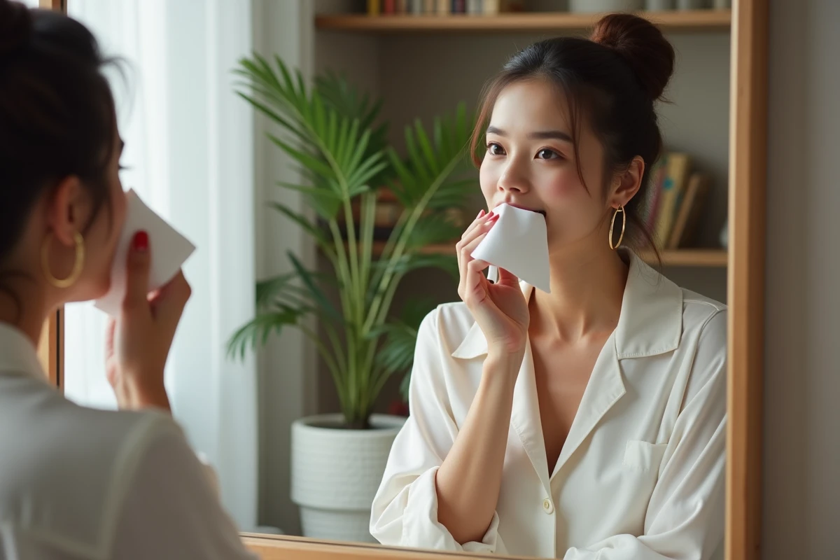 Autre astuce : superposer plusieurs couches fines, en tamponnant chaque passage avec un mouchoir. Cette technique améliore nettement la tenue. Pour finir, déposer un mouchoir sur la bouche et saupoudrer une touche de poudre libre ou translucide au pinceau. La couleur se fixe durablement, le fini reste mat, sans sensation d’assèchement.